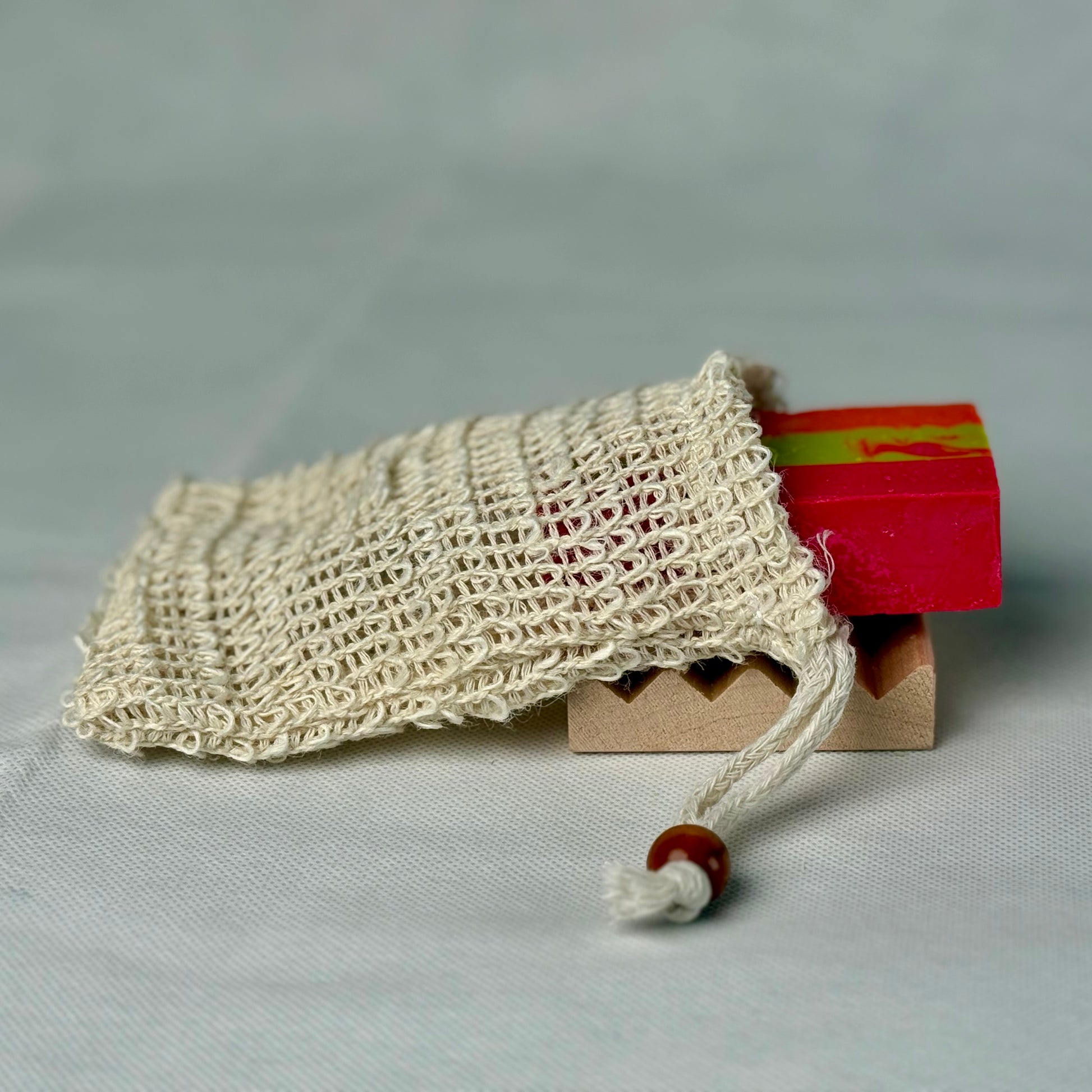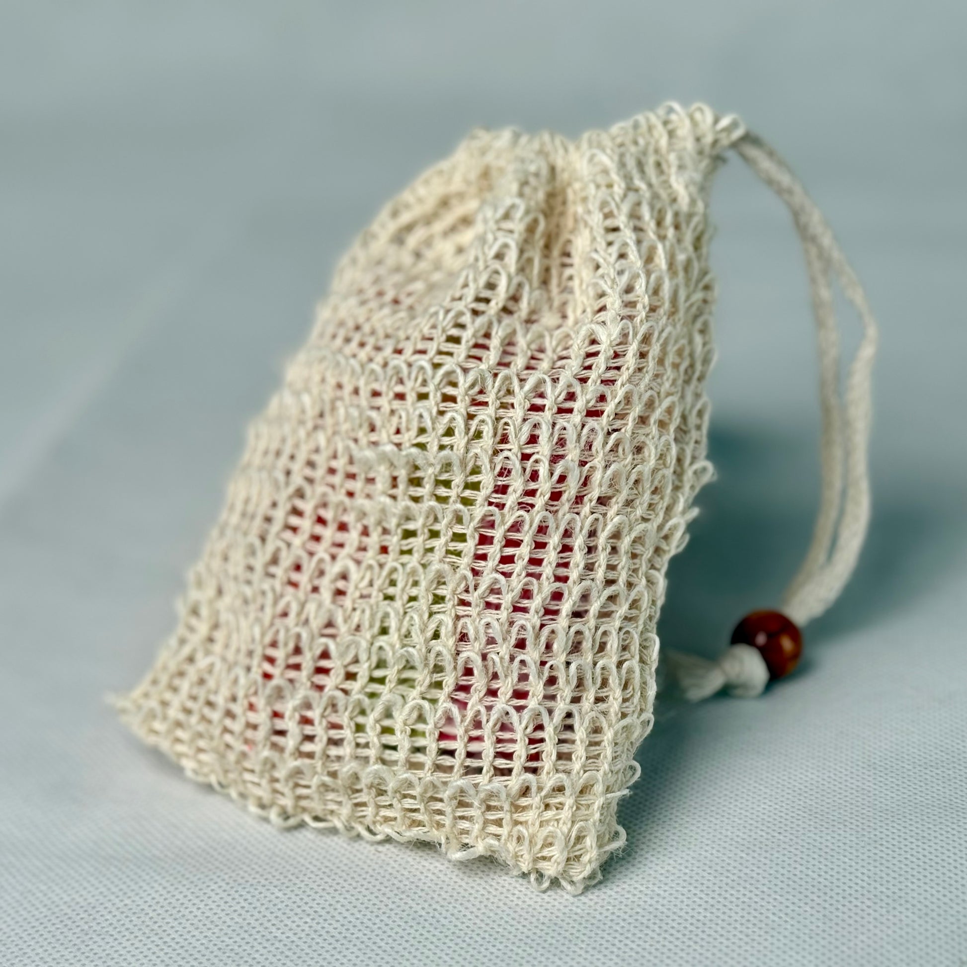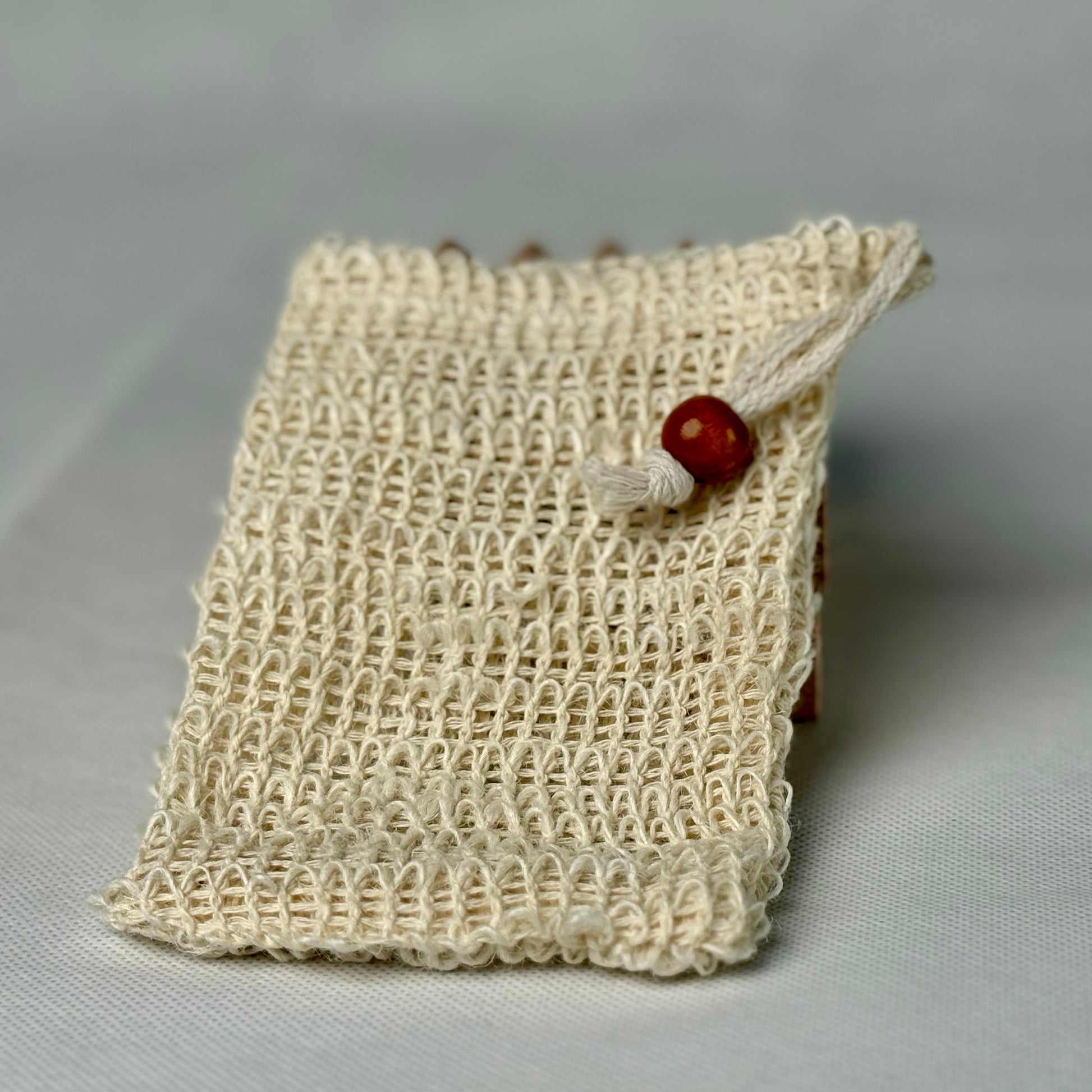 The Dirty Sack is a natural plant-based sisal soapsaver pouch, with coffee-color wood bead and drawstring.